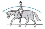 • het paard is (voor zover mogelijk) gelijkmatig gebogen van oor tot staart, conform de volte.