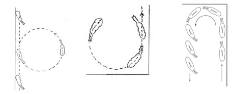 - halverwege de lange zijde een kleine volte rijden om te controleren of het paard zich goed tussen de hulpen van de ruiter beweegt
