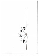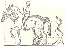 - het zwaartepunt van de ruiter (welke zich onder in de buik bevindt) wordt naar achteren richting het binnenachterbeen gebracht (zwarte pijl).